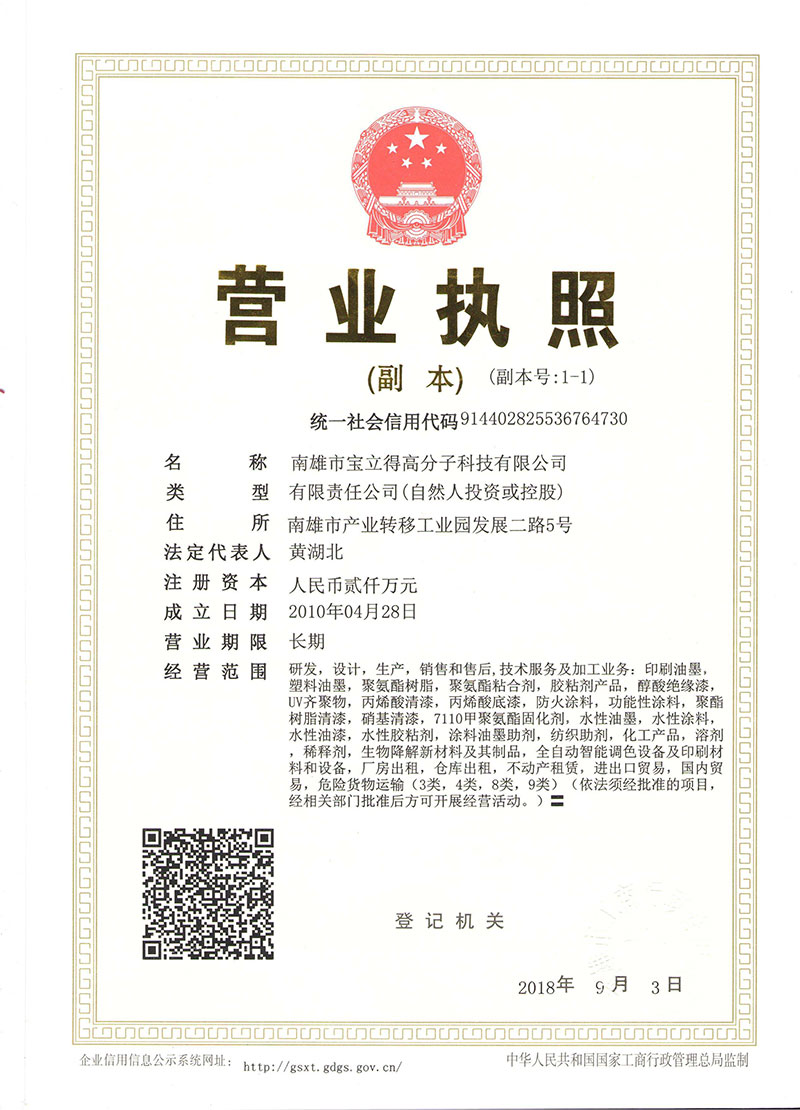东莞宝景化工有限公司,旗下拥有南雄宝立得高分子科技有限公司,71亩的生产基地,在东莞设有研发中心,越南设立分公司。公司拥有20年化工行业经验,独立的研发团队,12名资深技术工程师团队,与各大高校强强合作,通过不断研发,提升水性聚氨酯树脂的核心技术。拥有的聚氨酯树脂生产设备,以及完善的产品检测设备!产品质量稳定,已经先后通过ISO9001国际质量体系认证,欧盟ROCH、ROSH及危险化学品安全生产许可证等环保认证。